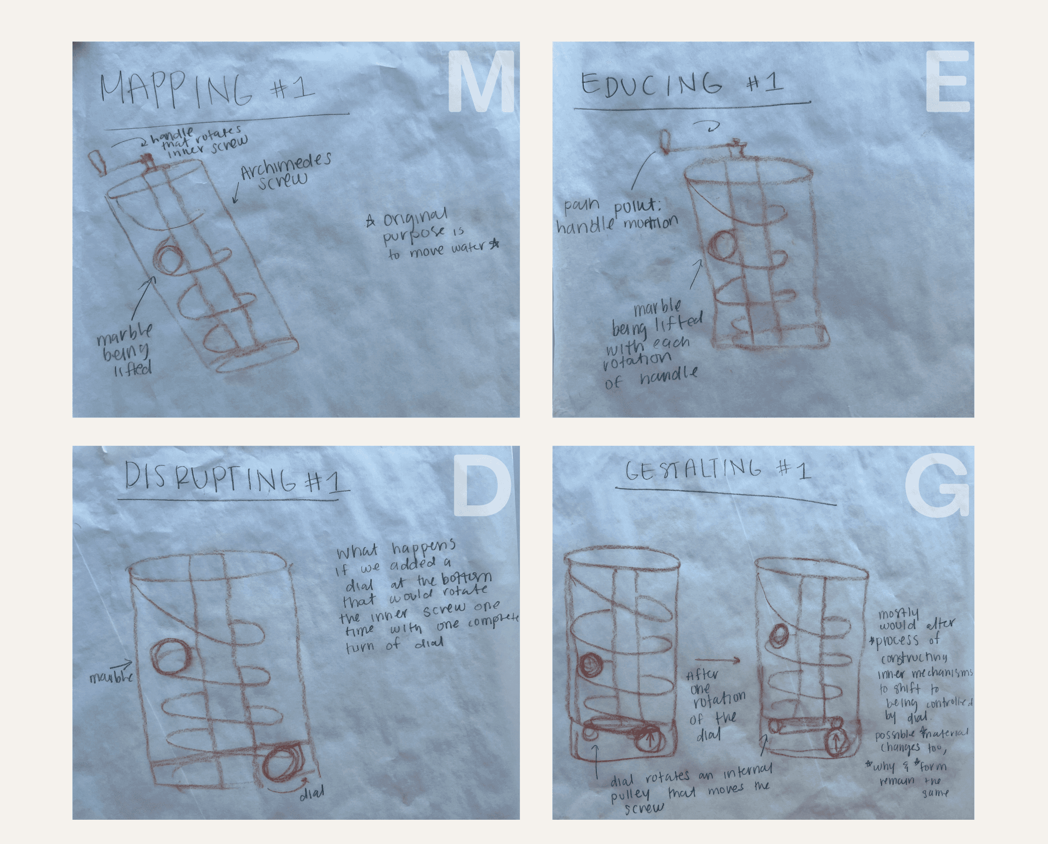 Began by mapping the original Archimedes Screw and its purpose. Then, educed the major pain point to be addressed — the handle motion and its variable delivery of power to the screw. Disrupted the current state by proposing a dial that could sent the marble up in one wind up. In the gestalting step, the details were sketched into a new screw.