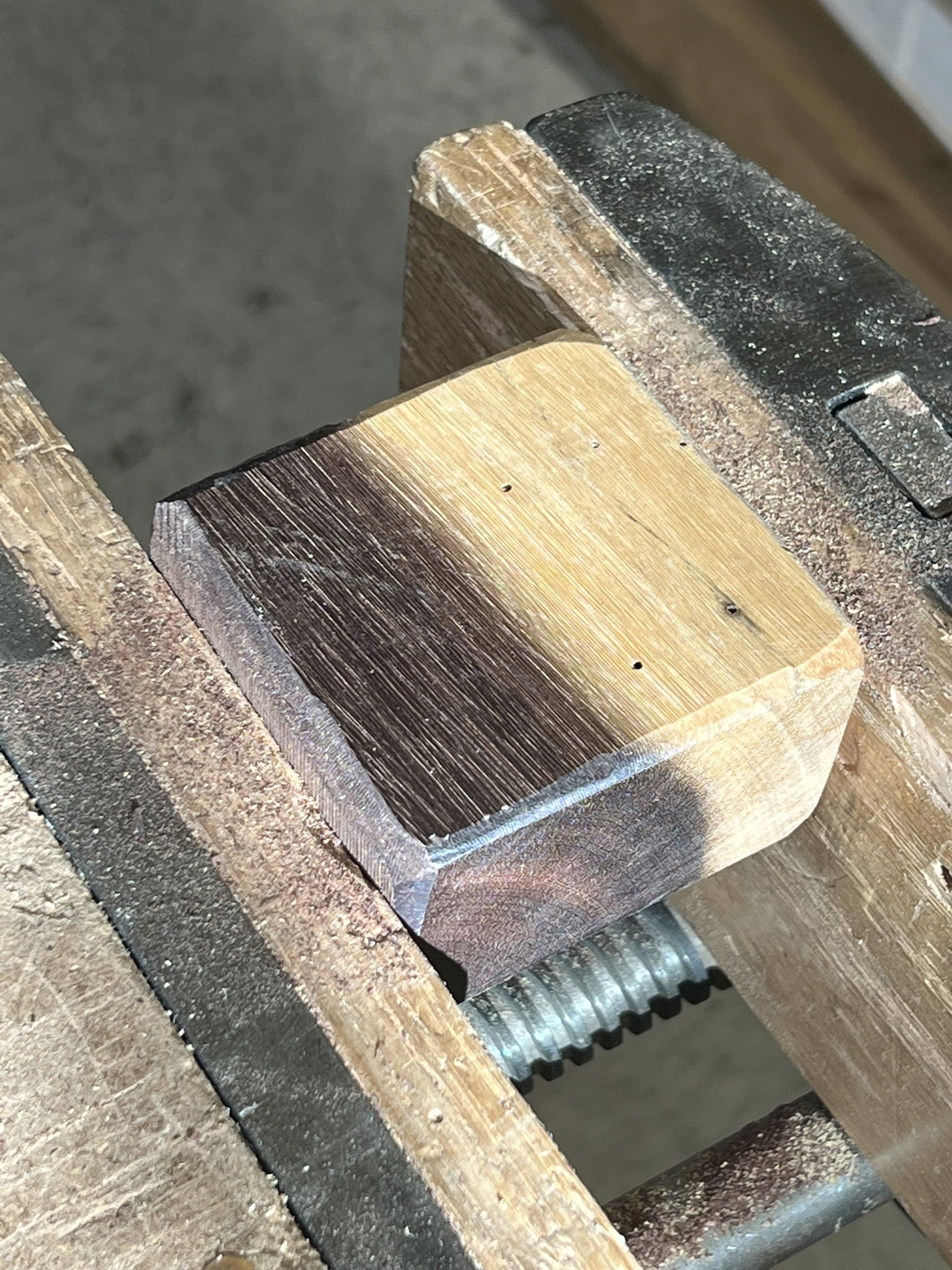 Selected this piece of wood for its unique coloring! Began rounding the corners with files and rasps.